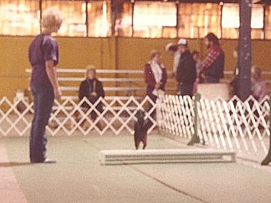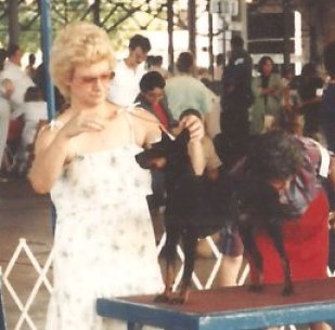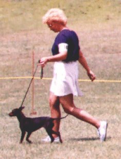 | In the very beginning - before showing Billy in the conformation ring - I entered Billy in obedience trials and he did quite well even with his unexpected antics, which then came to be known among several area show exhibitors as "Pulling a Billy"! Perhaps an explanation is in order here. Imagine doing the 'Out of Sight Sits and Downs' in Open obedience and coming back to find your dog has decided the ring stewards' laps are much warmer and cozier than that darn old hard rubber mat on the floor!! YES, Billy decided a couple of times he didn't want to lie down on the floor and when I'd return, there he'd be on the lap of one of the stewards with a MOST contented look on his face as if to say, "Hey, I'm down aren't I?" Billy did, however, earn his 3 legs for his CD title in FIVE trials and earned 2 legs toward his CDX before I decided to concentrate on showing him strictly in the Conformation ring. Those doing obedience trials with a Manchester Terrier know their highly trained dog may suddenly decide to come up with some of the MOST UNIQUE & UNBELIEVABLE antics for absolutely no reason whatsoever! |